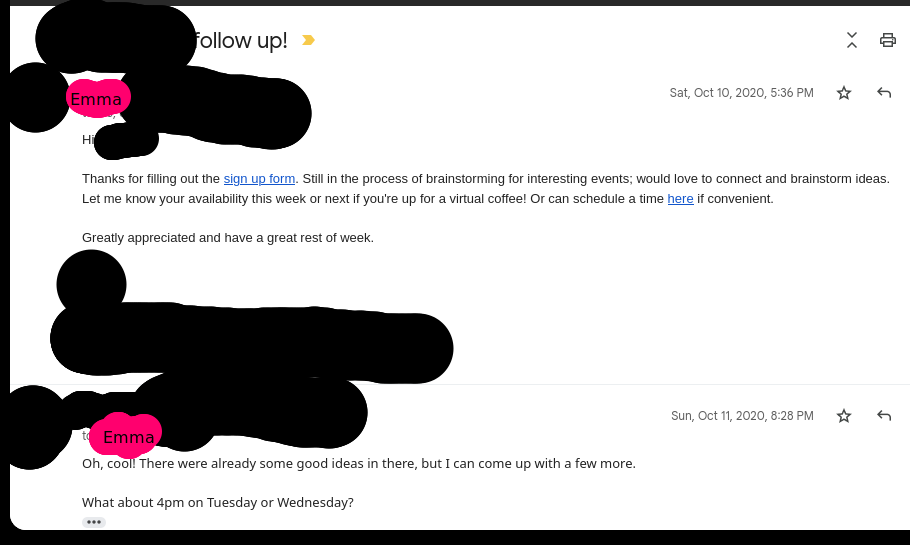 During Covid and around 11/01/2020, I chose to join a social group. The woman running it was named Emma. My stomach began to hurt horribly after the first week, and I dropped out.